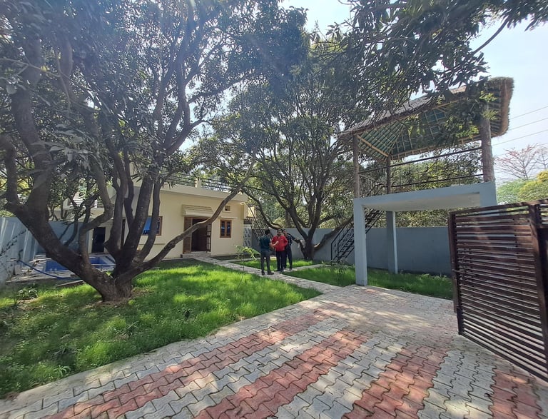 Reserve your luxury farmhouse experience amidst lush mango orchards and serene surroundings near Ganga.